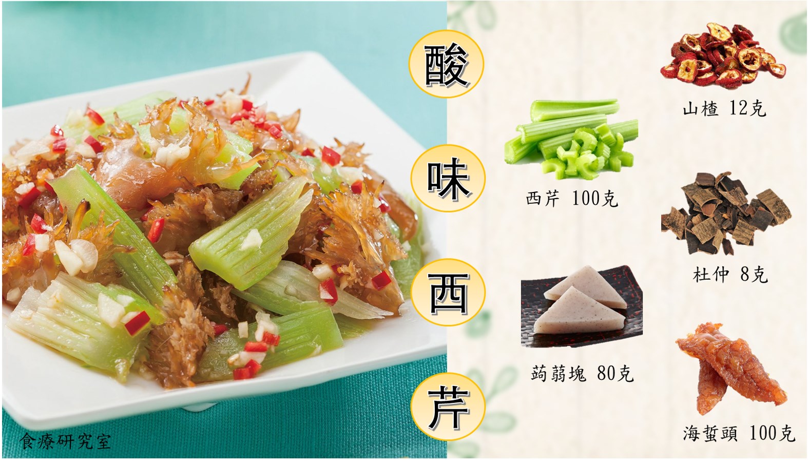山楂12克、杜仲8克、西芹100克、蒟蒻塊80克、海蜇頭100克、大蒜5顆、生薑3片